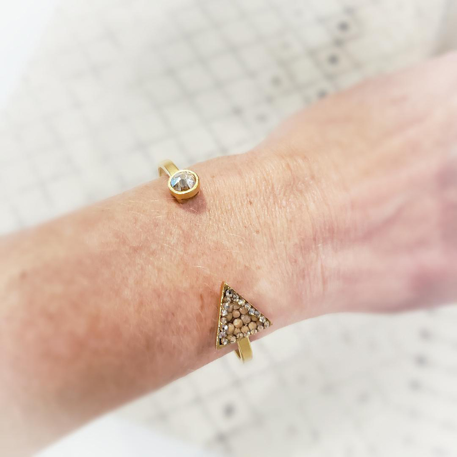 FAITH THAT MOVES & REMINDS. Adorned with an inlay of organic mustard seeds, and embellished with gold crystals one side of the delicate cuff bracelet and inlaid with a large gold crystal on the other side. Finishing metals are 14k plated, non-toxic and American-Made from recycled metal. Hand crafted by artisans in Fort Worth, Texas.
